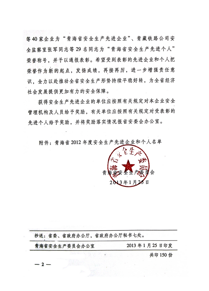 2012年,在省委、省政府的正確領(lǐng)導(dǎo)下,青海省物產(chǎn)集團總公司認(rèn)真學(xué)習(xí)貫徹黨的十八大精神,全面貫徹落實科學(xué)發(fā)展觀,牢固樹立以人為本、安全發(fā)展的理念,深入開展"安全生產(chǎn)年"、"隱患排查治理"、"打非治違"等活動,為促進(jìn)全省安全生產(chǎn)形勢持續(xù)穩(wěn)定好轉(zhuǎn)做出了積極貢獻(xiàn)。為此,經(jīng)省政府同意,省安全生產(chǎn)委員會決定授予青海省物產(chǎn)集團總公司"2012年度安全生產(chǎn)先進(jìn)企業(yè)"榮譽稱號。
